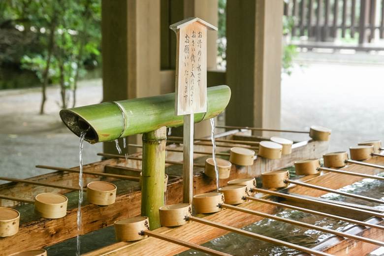 ก่อนเข้าสู่พื้นที่หลักสำหรับการ ขอพร ผู้สักการะทุกคนต้องทำ พิธีชำระล้าง ที่อ่างน้ำที่เรียกว่า เทมิสึยะ หรือ โชซึยะ โดยใช้ กระบวย (Hisaku) ตาม ขั้นตอน ดังนี้